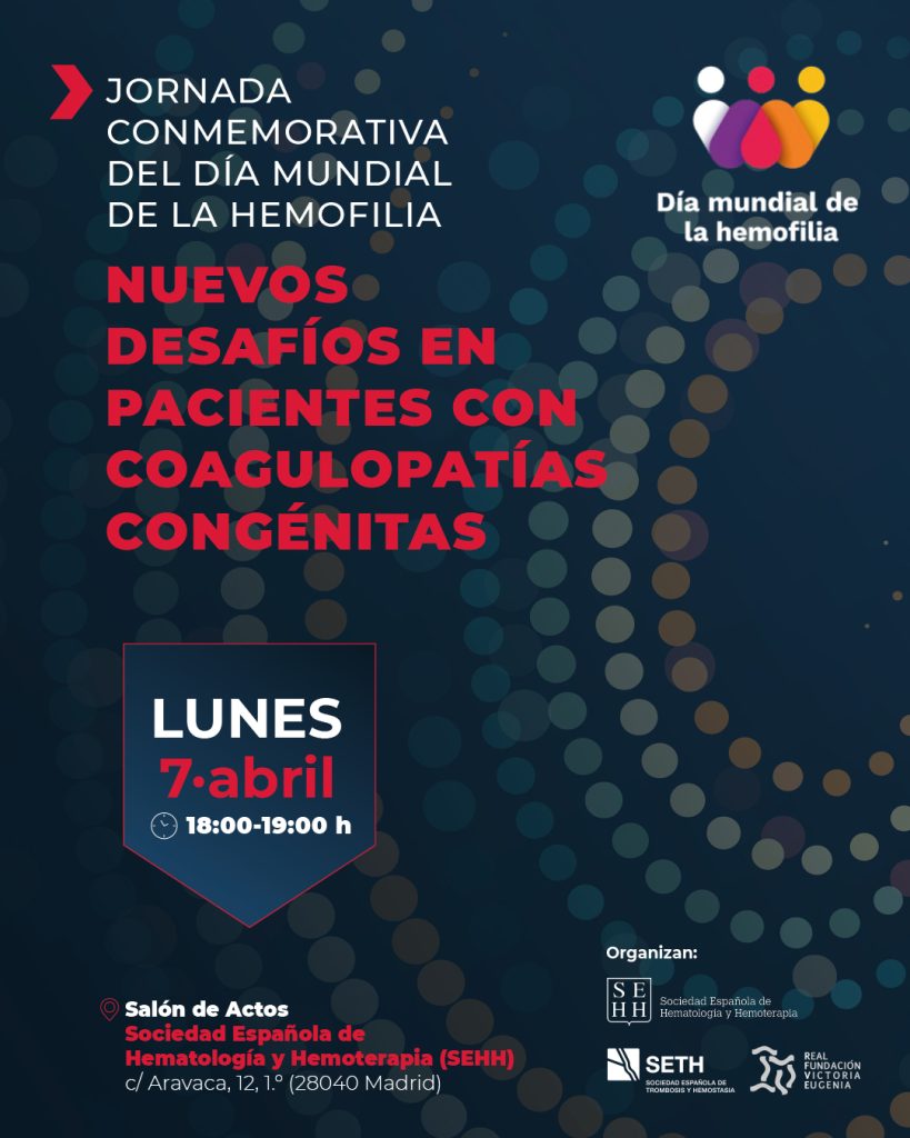 La Sociedad Española de Hematología y Hemoterapia (SEHH), la Sociedad Española de Trombosis y Hemostasia (SETH) y la Real Fundación Victoria Eugenia (RFVE) se unen a la conmemoración del Día Mundial de la Hemofilia, que se celebra cada 17 de abril, a través de una jornada conmemorativa que organizan de manera conjunta desde 2021, y que en esta edición ha contado con el apoyo de Novo Nordisk, Octapharma, Roche y Takeda.