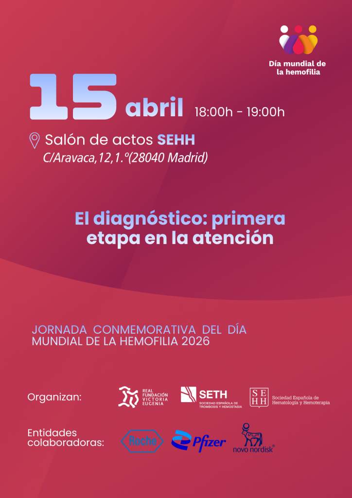 La Sociedad Española de Hematología y Hemoterapia (SEHH), la Sociedad Española de Trombosis y Hemostasia (SETH) y la Real Fundación Victoria Eugenia (RFVE) se unen a la conmemoración del Día Mundial de la Hemofilia, que se celebra cada 17 de abril, a través de una jornada conmemorativa que organizan de manera conjunta desde 2021, y que en esta edición cuenta con el apoyo de Roche, Pfizer y Novo Nordisk.